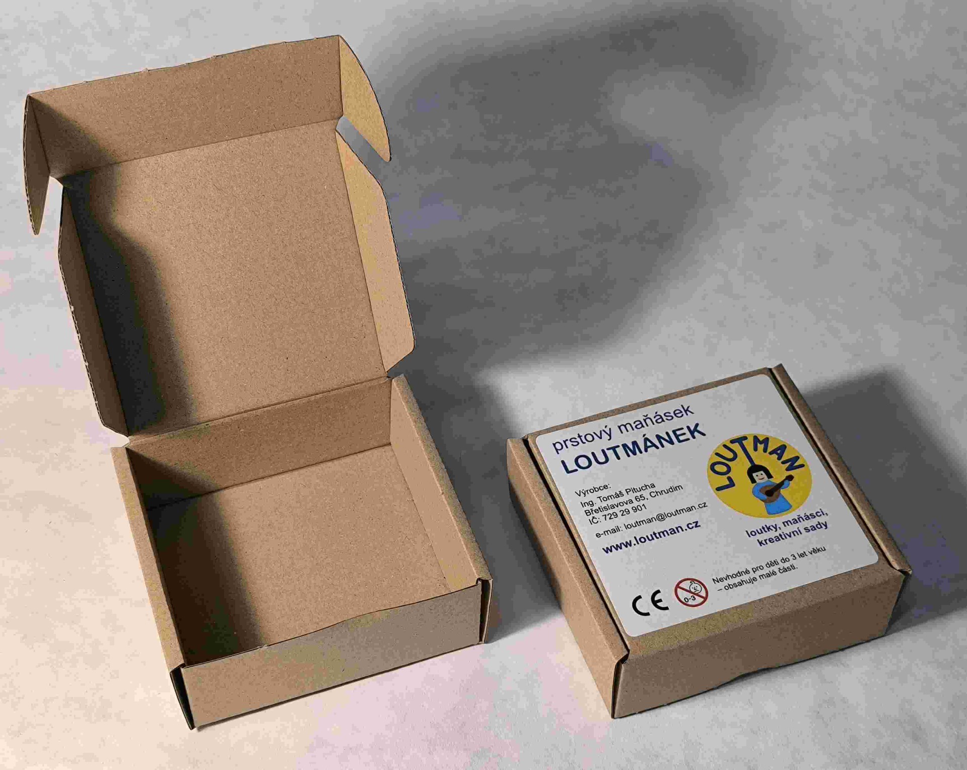 Krabička 10x10x4 cm s barevnou etiketou LOUTMAN. Do krabičky se vejdou 2 hotoví maňásci. Kupujete několik maňásků pro více dětí? Chcete, aby každé dítě mělo maňásky ve vlastní krabičce? Přiobjednejte si tuto krabičku/y. Pokud např. kupujete 6 maňásků pro 3 děti a objednáte si 2 malé krabičky navíc, dodáme Vám 3 dvojice maňásků zabalené ve 3 malých krabičkách. Pokud objednáte 6 maňásků a 1 malou krabičku navíc, dodáme Vám jednu dvojici maňásků zabalenou v malé krabičce a zbývající 4 maňásky ve velké krabičce (1 krabička je vždy součástí dodávky; standardně dodáváme všechny maňásky/kreativní sady v jedné společné krabičce přiměřené velikosti).
